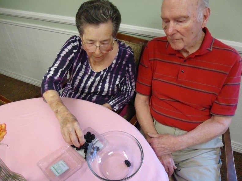 At Silverado, they have a lot of cool activities. Many residents just enjoy watching, but mom has busy hands and prefers to take part. Here she is with Keith, a nice quiet gentleman, counting berries into a bowl.