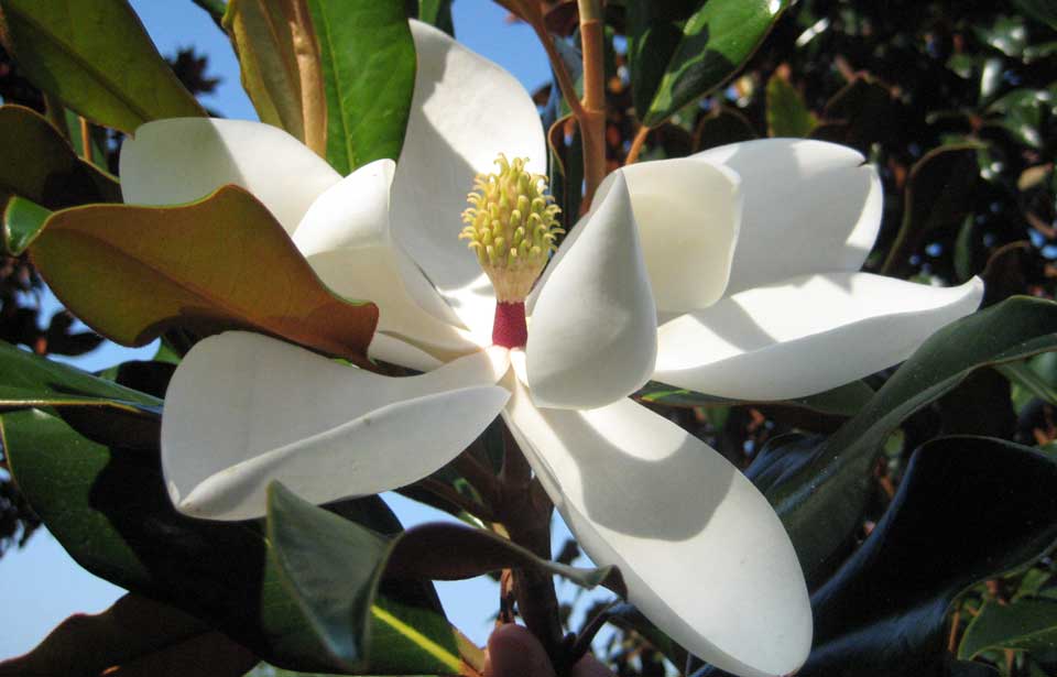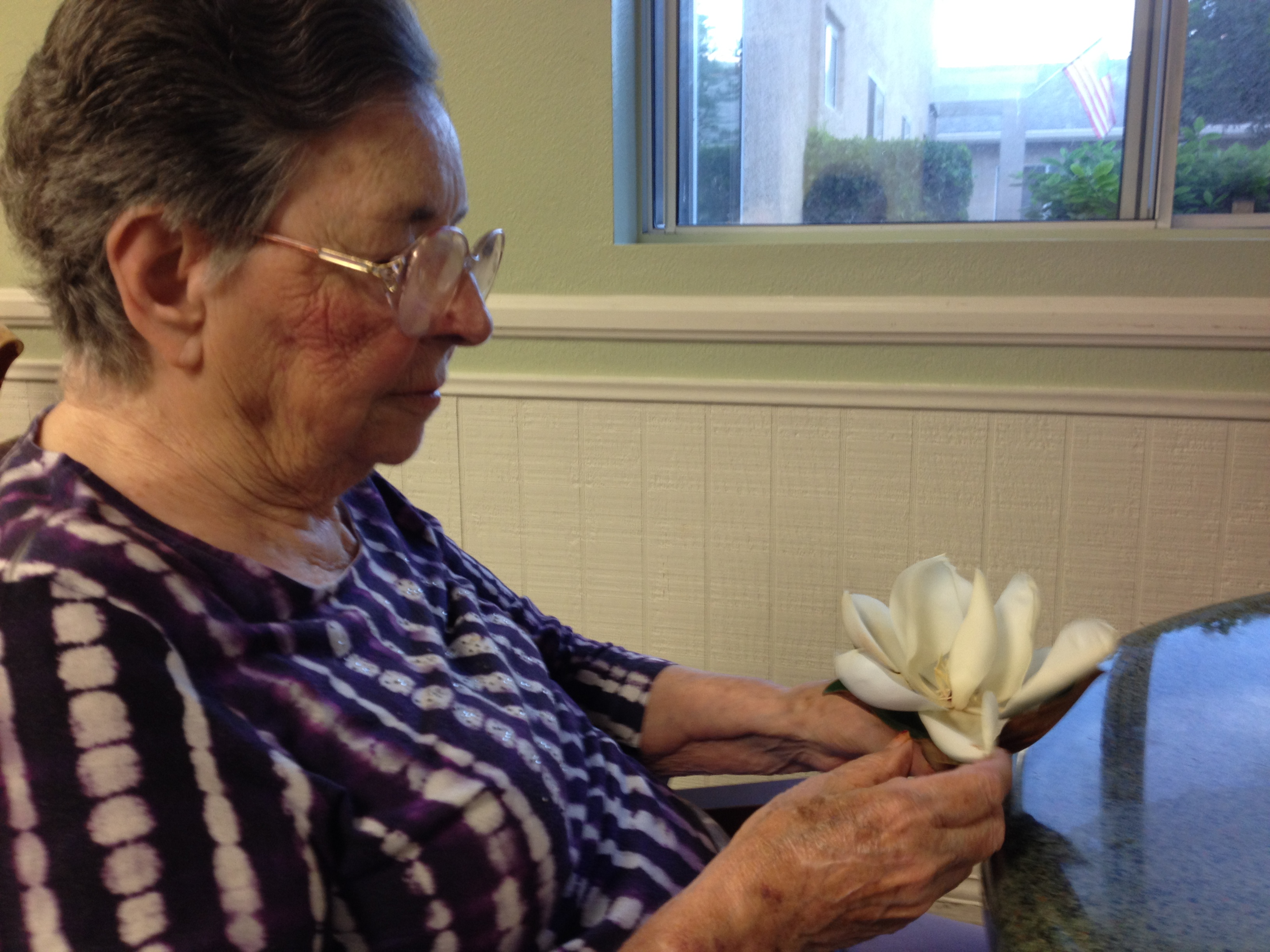 I really like how this photo came out. There is a small magnolia tree growing just outside this room. It was in bloom, so I went out and picked one for her. They smell just like lemon pies. She enjoyed smelling it, but I think she enjoyed pulling off some of its petals not long after I took the photo.