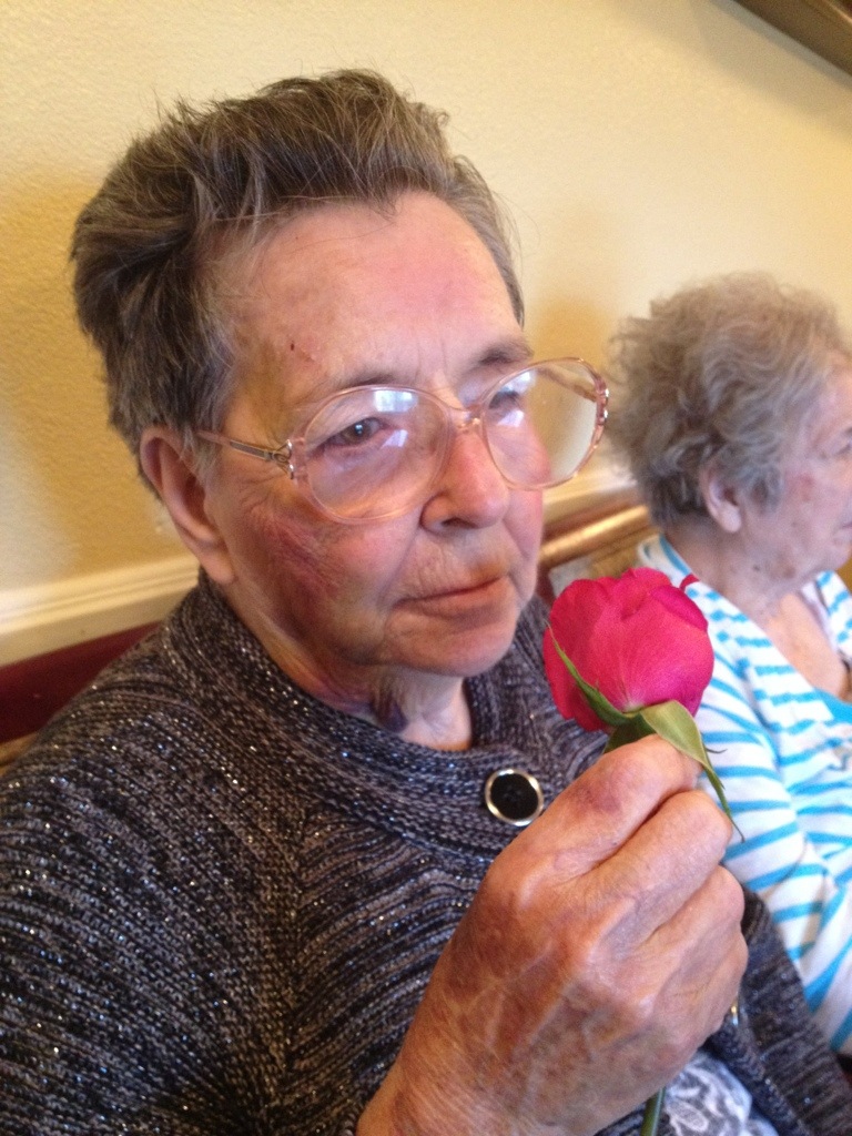 Here she is at another activity with flowers. A few days before she had a fall where she got pretty bruised up. See the right side of her face? Ouch. But she was pretty good. As I came in and she saw me, she said “here is my wonderful wonderful…..” and then she could not remember what. I give her half credit.