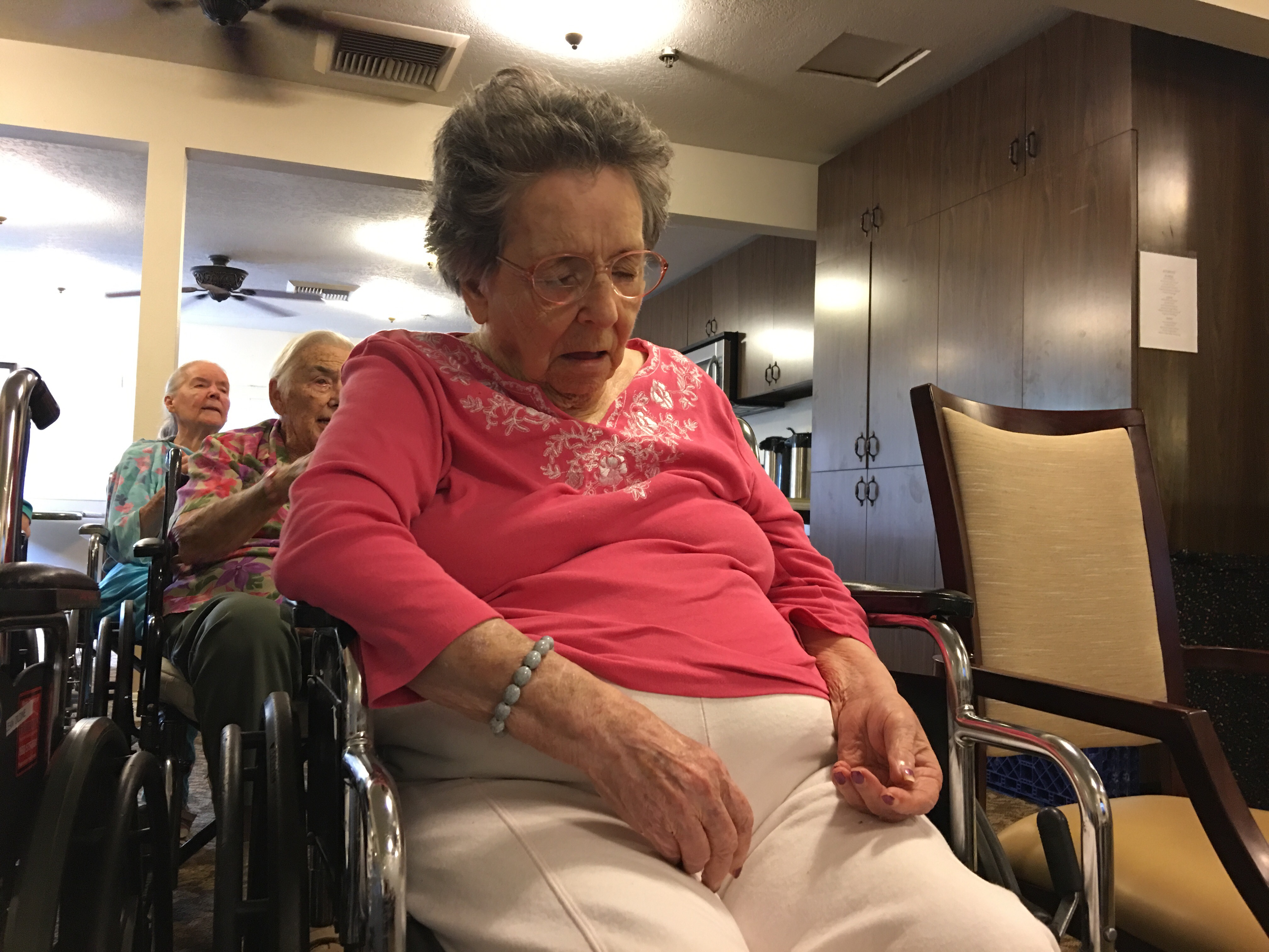 through first part of 2016, mom has really slowed down and isn’t very active or communicative at all. mostly stares at us for a few seconds and then looks away. doesn’t really respond each time when we speak to her. very sleepy and nods off quite a bit. can still finish off her meals. here she had just finished a meal and they took her in to join the others for a movie. she preferred another nap.