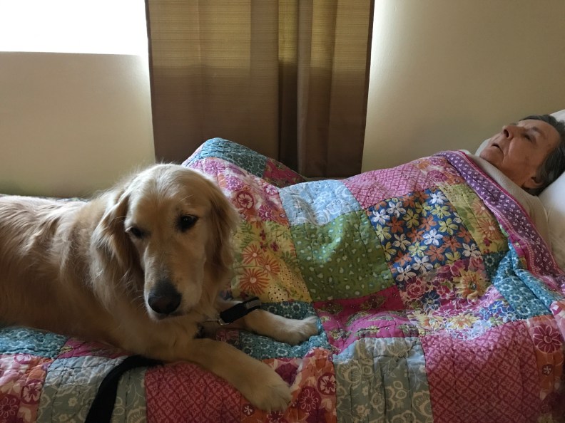 She has a new bed, a new wheelchair to help her be mobile around Silverado and more attention and meds as needed. Here she is in her new bed with Ella’s dog, Baby.
